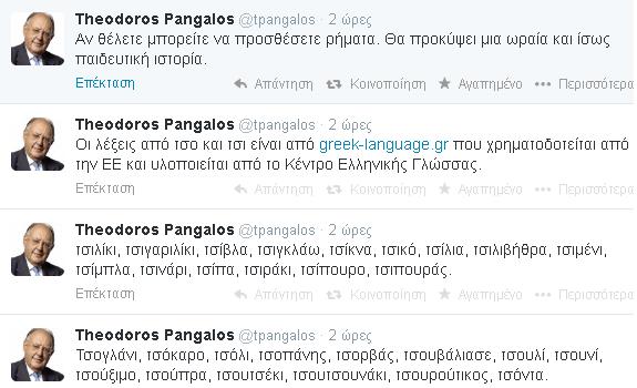 Σε νέο ρεσιτάλ ξέσπασε σήμερα στο twitter o Θεόδωρος Πάγκαλος, ο οποίος αποφάσισε να αναρτήσει στο γνωστό ιστότοπο κοινωνικής δικτύωσης ένα σχόλιο με αρκετές λέξεις που ξεκινούν από… τσο και τσι.