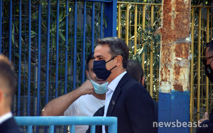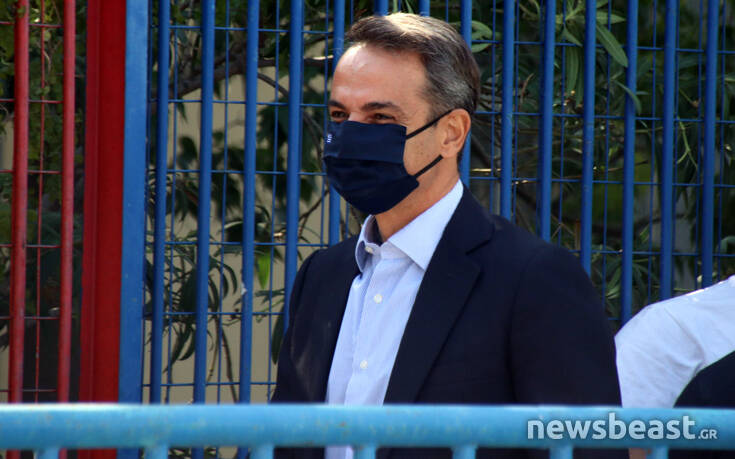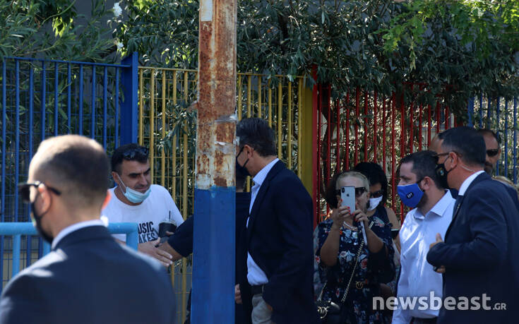 Φορώντας μια μαύρη μάσκα στο πρόσωπό του έφτασε ο πρωθυπουργός Κυριάκος Μητσοτάκης στο 7ο Δημοτικό Σχολείο Αγίων Αναργύρων το πρωί της Δευτέρας 14 Σεπτεμβρίου.