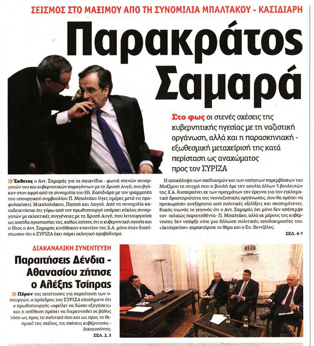 Η Αυγή μιλά για «Παρακράτος Σαμαρά», όπως και η Ελευθεροτυπία με τίτλο «Παρακράτος στο Μαξίμου».