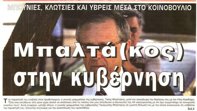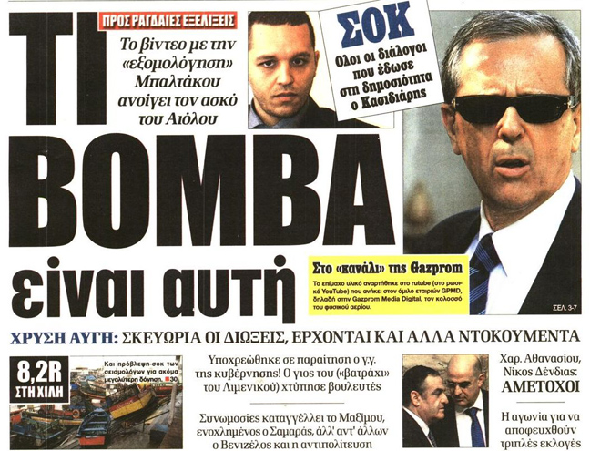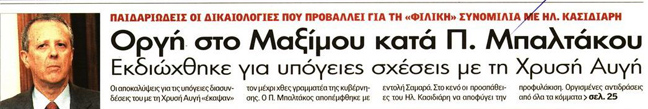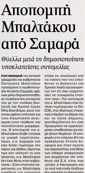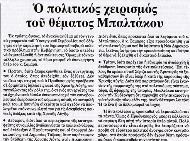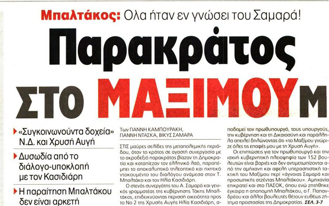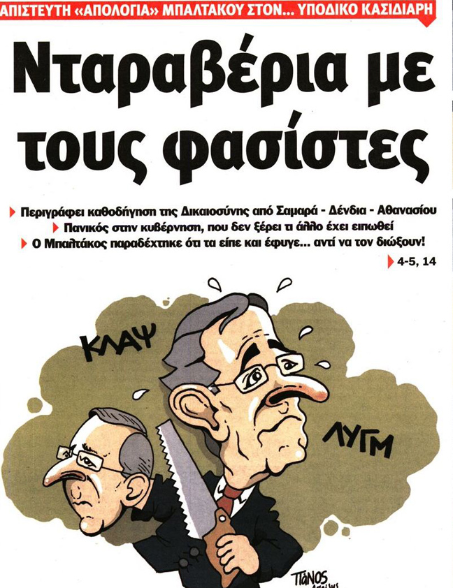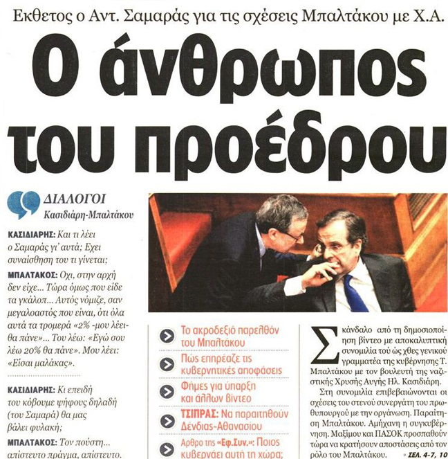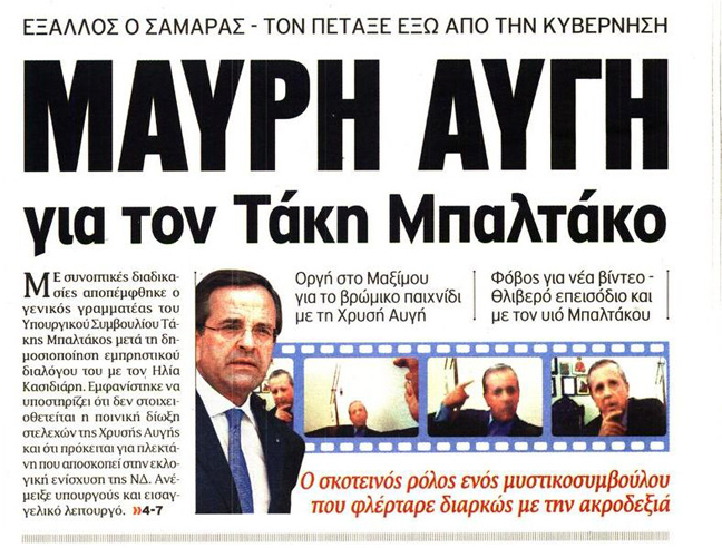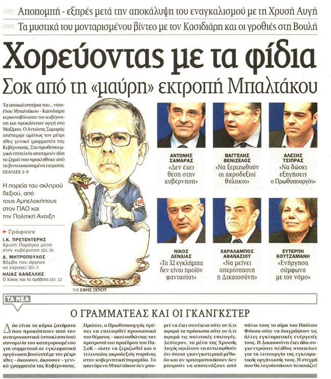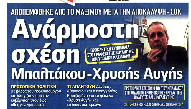 «Ανάρμοστη σχέση Μπαλτάκου-Χρυσής Αυγής», είναι ο τίτλος της εφημερίδας Ελεύθερος Τύπος. Ακολουθεί εκείνος των «Νέων» που είναι «Χορεύοντας με τα φίδια-Σοκ από τη μαύρη εκτροπή Μπαλτάκου».