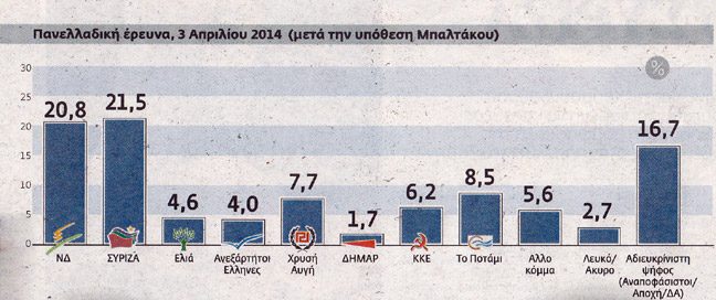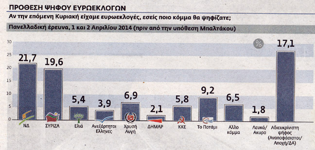 Στο ερώτημα αν μαζί με τις ευρωεκλογές πρέπει να γίνουν και βουλευτικές τα ποσοστά διαμορφώθηκαν ως εξής (μετά την υπόθεση Μπαλτάκου): «Όχι» είπε το 55,2%, «ναι» το 35,9% και «δεν ξέρω, δεν απαντώ» το 8,9%.’