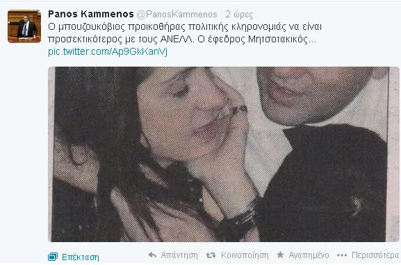 Ο πρόεδρος των ΑΝΕΛ ανήρτησε στον προσωπικό του λογαριασμό στο twitter φωτογραφία από έξοδο του Ανδρέα Παπαδόπουλου με τη σύντροφό του, Αλεξία Μπακογιάννη, και σχολίασε: «Ο μπουζουκόβιος προικοθήρας πολιτικής κληρονομιάς να είναι προσεκτικότερος με τους ΑΝΕΛ. Ο έφεδρος Μητσοτακικός…».