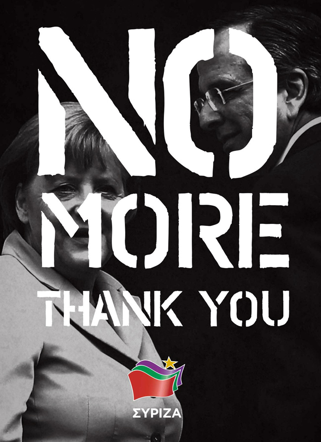 Με διαδήλωση στο κέντρο της Αθήνας «υποδέχεται» ο ΣΥΡΙΖΑ τη Γερμανίδα καγκελάριο Άγκελα Μέρκελ. Για τις ανάγκες της, μάλιστα, τυπώθηκαν δύο αφίσες, στις οποίες αναγράφονται τα συνθήματα «NO MORE, THANK YOU» στη μία και «Ποτέ ξανά μνημόνια» στην άλλη.