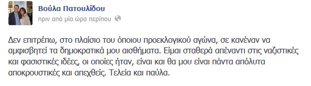 Η Βούλα Πατουλίδου απάντησε με σχόλιό της στο facebook: «Δεν επιτρέπω, στο πλαίσιο του όποιου προεκλογικού αγώνα, σε κανέναν να αμφισβητεί τα δημοκρατικά μου αισθήματα. Είμαι σταθερά απέναντι στις ναζιστικές και φασιστικές ιδέες, οι οποίες ήταν, είναι και θα μου είναι πάντα απόλυτα αποκρουστικές και απεχθείς. Τελεία και παύλα».