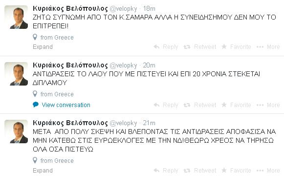 Όπως τόνισε σε ανάρτησή του στον Twitter, υπάρχουν αντιδράσεις από τον κόσμο και δεν του επιτρέπει η συνείδηση του να κατέβει με τον Αντώνη Σαμαρά.