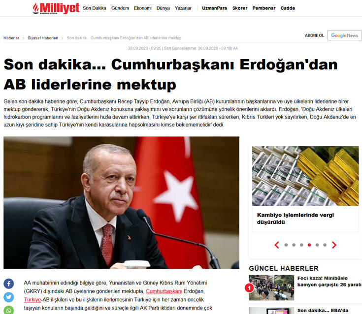 Σύμφωνα με τη Sabah, ο Ερντογάν δεν συμπεριέλαβε στην επιστολή Ελλάδα και Κύπρο.
