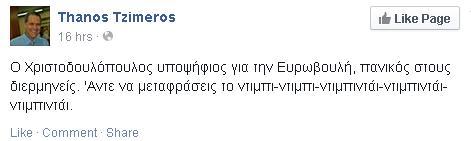 Ανάμεσα σε αυτά, ενδιαφέρον έχει και το σχόλιο του Θάνου Τζήμερου ο οποίος έγραψε στην προσωπική του σελίδα στο Facebook: «Ο Χριστοδουλόπουλος υποψήφιος για την Ευρωβουλή, πανικός στους διερμηνείς. Άντε να μεταφράσεις το ντιμπι-ντιμπι-ντιμπιντάι-ντιμπιντάι- ντιμπιντάι.»