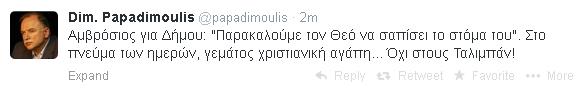 «Αμβρόσιος για Δήμου: “Παρακαλούμε τον Θεό να σαπίσει το στόμα του”. Στο πνεύμα των ημερών, γεμάτος χριστιανική αγάπη… Όχι στους Ταλιμπάν!», έγραψε ο κ. Παπαδημούλης στον προσωπικό του λογαριασμό.