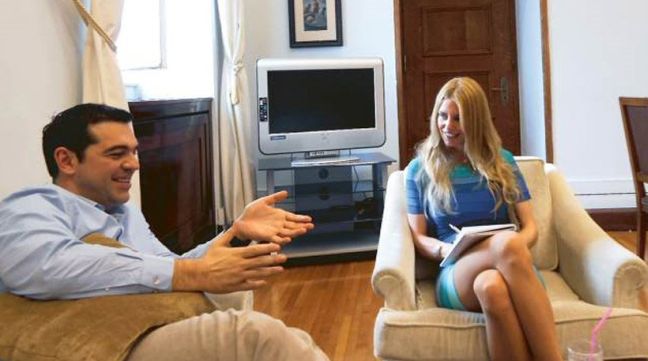 Στις φωτογραφίες από τη συνάντηση του κ. Τσίπρα με τη σουηδέζα δημοσιογράφο φαίνεται ότι η άνεσή της προκαλεί αμηχανία στον πρόεδρο του ΣΥΡΙΖΑ, εξ ου και τα πλατιά χαμόγελα και το… γράπωμα του μαξιλαριού!