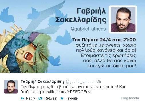 «Χωρίς πολλούς κανόνες και όρια» θα είναι η συζήτηση που θα έχουν τη δυνατότητα να κάνουν οι χρήστες του Twitter με τον Γαβριήλ Σακελλαρίδη.
