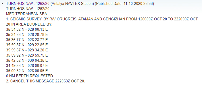 Όπως αναφέρει η νέα οδηγία της Τουρκίας, το ερευνητικό θα συνοδεύεται από τα πλοιάρια ATAMAN και CENGİZHAN.