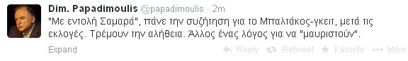 «”Με εντολή Σαμαρά”, πάνε την συζήτηση για το Μπαλτάκος-γκειτ, μετά τις εκλογές. Τρέμουν την αλήθεια. Άλλος ένας λόγος για να “μαυριστούν”», αναφέρει το σχόλιο του.