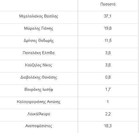 Προβάδισμα 17 μονάδων στο Βασίλη Μιχαλολιάκο έναντι του Γ. Μώραλη δίνει δημοσκόπηση. Στην ερώτηση επιλογής του υποψηφίου που θα ψήφιζαν οι ερωτώμενοι εάν είχαμε την επόμενη Κυριακή Δημοτικές Εκλογές και έπρεπε να επιλέξουν μόνο έναν από τους υποψηφίους, ο κ. Μιχαλολιάκος (37,1%) προηγείται με διαφορά 17,3 ποσοστιαίων μονάδων από τον κ. Μώραλη (που συγκεντρώνει 19,8%).