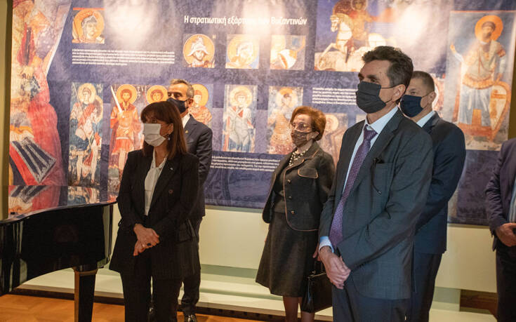 Επίσης, σημείωσε πως η ξενάγησή της στη Δημοτική Πινακοθήκη και στην έκθεση με θέμα «Στρατιωτικοί Άγιοι του Βυζαντίου» της έφερε στο νου μια υποβλητική εικόνα του φημισμένου ζωγράφου Μιχαήλ Δαμασκηνού, που βρίσκεται στο Μουσείο Μπενάκη, για την οποία είπε τα εξής: «Είναι μια ιδιαίτερα εκφραστική σύνθεση φιλοτεχνημένη με σχεδιαστική τόλμη και θερμή χρωματική παλέτα. Ο Δαμασκηνός παρουσιάζει τον Χριστό να ευλογεί τέσσερις στρατιωτικούς αγίους, που απεικονίζονται πάνω στα άλογά τους, κρατώντας στα χέρια τους το σύμβολο του μαρτυρίου τους, ατενίζοντας τους αγγέλους που κατέρχονται από τα νέφη για να τους στέψουν το “ουράνιο στέφος”.