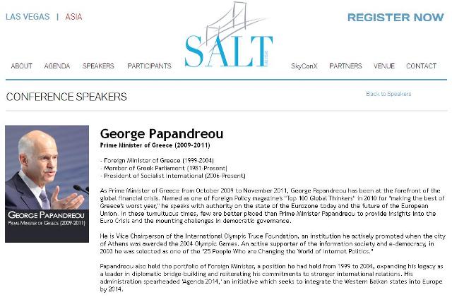 Ο κ. Παπανδρέου είναι ομιλητής σε συνέδριο της εταιρείας επενδύσεων SkyBridge Capital το οποίο πραγματοποιείται στο διάσημο καζίνο Bellagio και ολοκληρώνει αύριο 16 Μαΐου τις εργασίες του.