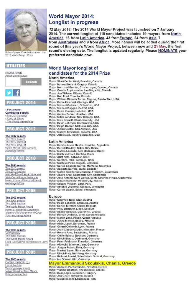Στη λίστα των υποψηφίων δημάρχων περιλαμβάνονται εκπρόσωποι από τη Βόρειο και τη Λατινική Αμερική, την Ασία, την Αυστραλία, την Αφρική, ενώ 43 είναι οι υποψήφιοι από την Ευρώπη. Μεταξύ αυτών περιλαμβάνονται και 3 από την Ελλάδα: ο δήμαρχος Χανίων, Μανώλης Σκουλάκης, ο δήμαρχος Θεσσαλονίκης, Γιάννης Μπουτάρης και ο δήμαρχος Περιστερίου, Ανδρέας Παχατουρίδης.