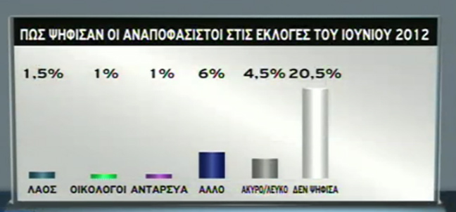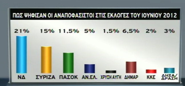 Ειδικότερα, σύμφωνα με την έρευνα που παρουσιάστηκε στο κεντρικό δελτίο ειδήσεων του ΣΚΑΪ της Πέμπτης, αποκαλύπτεται ότι στις κρισιμότατες εκλογές του 2012 ένα μεγάλο ποσοστό των αναποφάσιστων – της τάξης του 20,5%, δεν πήγαν στις κάλπες. Όσον αφορά το πώς ψήφισαν, το 21% ψήφισε ΝΔ, το 15% ΣΥΡΙΖΑ, το 11,5% ΠΑΣΟΚ, το 6,5% ΔΗΜΑΡ, το 5% ΑΝΕΛ, το 2% ΚΚΕ, το 1,5% Χρυσή Αυγή.
