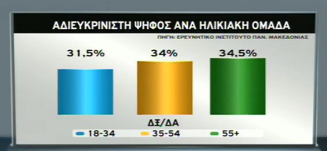 Όσον αφορά τις ηλικιακές ομάδες, το 65,5% ανήκει στην ομάδα έως 54 ετών (31,5% οι ηλικίας 18 έως 34 ετών και 34% οι ηλικίας 35 έως 54 ετών) ενώ άνω των 55 ετών είναι το 34,5% των αναποφάσιστων ψηφοφόρων.