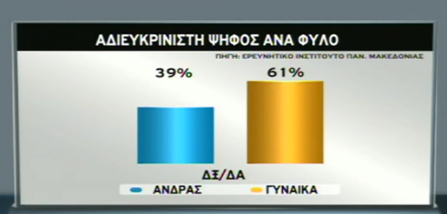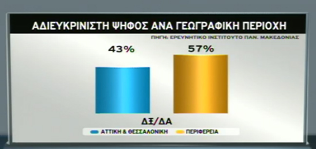 Όσον αφορά τη γεωγραφική περιοχή, το 43% των αναποφάσιστων ψηφοφόρων προέρχεται από Αθήνα και Θεσσαλονίκη και το 57% από την επαρχία.