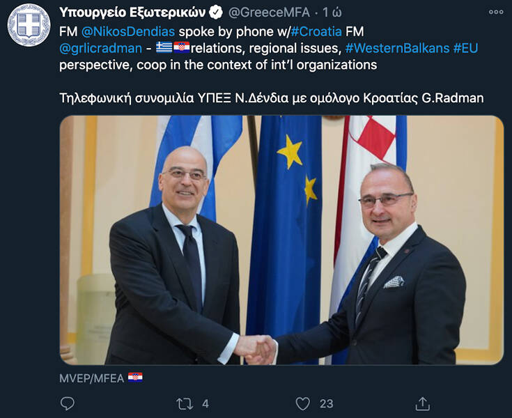 Τηλεφωνική επικοινωνία με τον υπουργό Εξωτερικών της Κροατίας κ. Γκόρνταν Ράντμαν είναι σήμερα ο Έλληνας ομόλογός του, Νίκος Δένδιας.