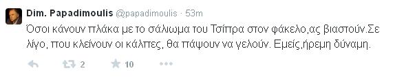 «Όσοι κάνουν πλάκα με το σάλιωμα του Τσίπρα στον φάκελο, ας βιαστούν. Σε λίγο, που κλείνουν οι κάλπες, θα πάψουν να γελούν. Εμείς, ήρεμη δύναμη», έγραψε χαρακτηριστικά ο κ. Παπαδημούλης.