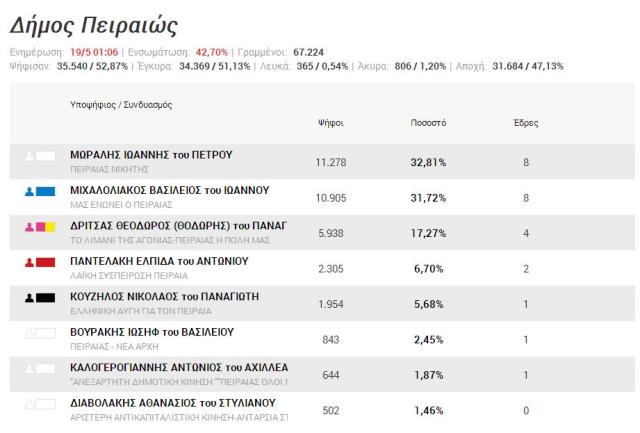 Δείτε τα αποτελέσματα στο δήμο Πειραιώς Ενημέρωση: 01.06 Ενσωμάτωση 42,70%