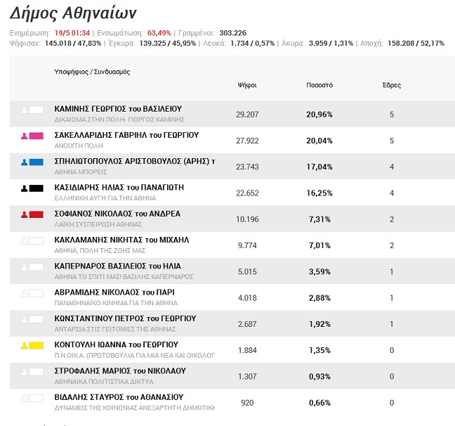 Ο Γ. Καμίνης βρίσκεται μπροστά, αυτή τη στιγμή, με την ενσωμάτωση να αγγίζει το 64%, με τον Γ. Σακελλαρίδη να ακολουθεί. Η διαφορά των δύο υποψήφιων είναι λιγότεροι από 1.300 ψήφοι, κάτι που σημαίνει πως το αποτέλεσμα μπορεί να αλλάξει ανά πάσα στιγμή.