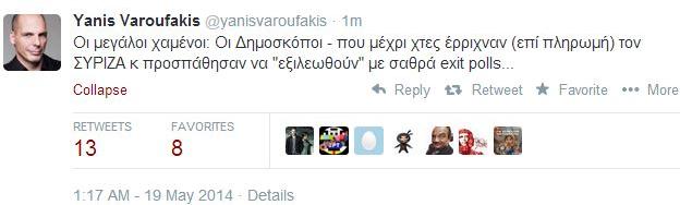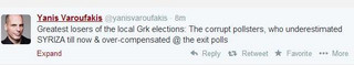 Σύμφωνα με τον Γιάννη Βαρουφάκη, όπως έγραψε στα αγγλικά του στον προσωπικό του λογαριασμό στο Twitter, οι μεγάλοι ηττημένοι των αυτοδιοικητικών εκλογών είναι «οι δημοσκόποι».
