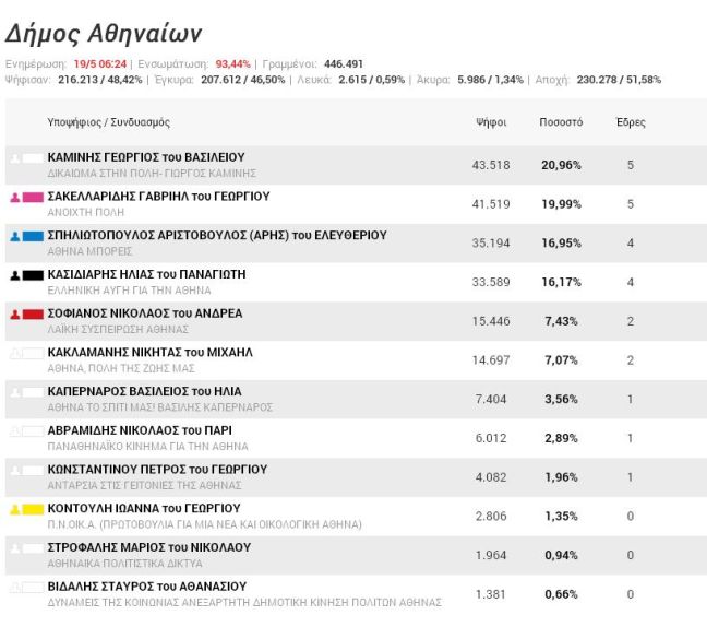 Συγκεκριμένα για το δήμο Αθηναίων με ενσωματωμένο το 92,45 % (ενημέρωση στις 6:18) των εκλογικών τμημάτων ο Γιώργος Καμίνης συγκεντρώνει ποσοστό 20,98% ενώ ο Γαβριήλ Σακελλαρίδης βρίσκεται στη δεύτερη θέση με 19,99% και θα παλέψει μαζί του την επόμενη Κυριακή στο δεύτερο γύρο.