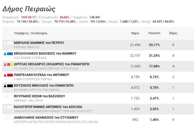 Στον Δήμο Πειραιά με ενσωματωμένο το 86,80% (ενημέρωση στις 6:17) προηγείται ο Γιάννης Μώραλης με 33,07%, ενώ ο Βασίλης Μιχαλολιάκος συγκεντρώνει το ποσοστό του 31,34%.