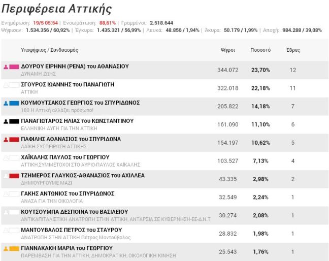 Στην Περιφέρεια Αττικής με ενσωματωμένο το 88,61% (ώρα ανανέωσης 5:54) η Ρένα Δούρου προηγείται με 23,70% και στη δεύτερη θέση έρχεται ο Γιάννης Σγουρός με 22,18%.