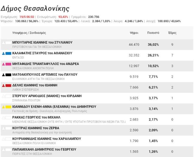 Για τη Θεσσαλονίκη με ενσωματωμένο το 931,43 % (ενημέρωση στις 6:02) στην πρώτη θέση βρίσκεται ο νυν δήμαρχος Γιάννης Μπουτάρης με 36,02% και ακολουθεί ο Σταύρος Καλαφάτης με 26,21%.