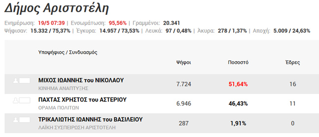 Χάνει το δήμο Αριστοτέλη στις Σκουριές από την πρώτη Κυριακή των Δημοτικών Εκλογών ο Χρήστος Πάχτας, αφού νικητής είναι ο Γιάννης Μίχος, που είναι μέλος του κινήματος κατά των μεταλλείων.