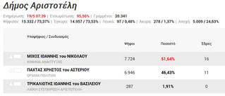 Με καταμετρημένο το 95,56% των τμημάτων ο Γιάννης Μίχος συγκεντρώνει ποσοστό 51,64% έναντι 46,43% του Χρήστου Πάχτα.