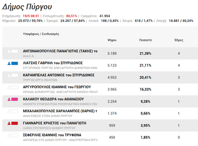 Με το ποσοστό ενσωμάτωσης στο 78, 81%, προηγείται ο Τάκης Αντωνακόπουλος με ποσοστό 21,58% και 5.114 ψήφους και ακολουθούν ο Γαβριήλ Λιάτσης με ποσοστό 21,09% και 4.997 ψήφους και ο Αντώνης Καράμπελας με ποσοστό 20,5% και 4.857 ψήφους.