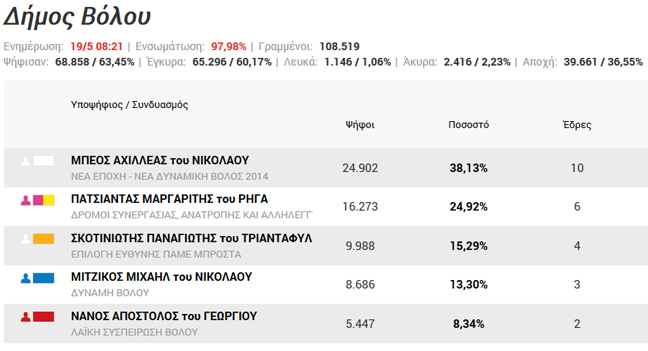 Την πρώτη θέση στο δήμο Βόλου καταλαμβάνει μετά τον πρώτο γύρο των αυτοδιοικητικών εκλογών ο Αχιλλέας Μπέος. Ο πρώην μεγαλομέτοχος του Ολυμπιακού Βόλου συγκεντρώνει ποσοστό 38,13% και 24.902 ψήφους- με την ενσωμάτωση να φτάνει στο 97,98%- και θα διεκδικήσει τη δημαρχία στον β’ γύρο, την επόμενη Κυριακή.