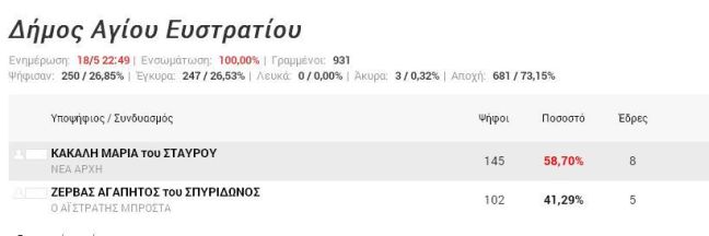 Η επικεφαλής του συνδυασμού «Νέα Αρχή» έλαβε ποσοστό 58,70% και 145 ψήφους. Ο μοναδικός της αντίπαλος ο συνδυασμός «Ο Άη Στράτης μπροστά» του Αγαπητού Ζέρβα έλαβε ποσοστό 41,29% και 102 ψήφους.