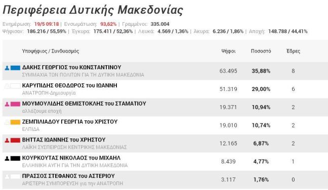 Ο συνδυασμός του «Συμμαχία των Πολιτών για τη Δυτική Μακεδονία» προηγείται στην καταμέτρηση των ψήφων (στο 93,62% των εκλογικών τμημάτων), με ποσοστό 35,88% έναντι 29% του συνδυασμού «ΑΝΑΤΡΟΠΗ – Δημιουργία» του Θεόδωρου Καρυπίδη και η «μάχη» για την ανάδειξη του περιφερειάρχη Δυτικής Μακεδονίας θα κριθεί στον β’ γύρο.