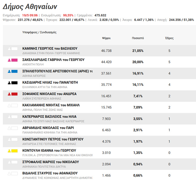 Με την ενσωμάτωση να φτάνει στο 99,55%, ο κ. Καμίνης συγκεντρώνει ποσοστό 21,5% και 46.738 ψήφους και ο κ. Σακελλαρίδης ποσοστό 20% και 44.420 ψήφους.