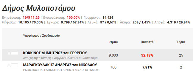 Όχι μόνο εξελέγη δήμαρχος από την πρώτη Κυριακή αλλά και με πάρα πολύ υψηλό ποσοστό. Ο Δημήτρης Κόκκινος αναδείχθηκε πανηγυρικά νικητής στην εκλογική αναμέτρηση του δήμου Μυλοποτάμου, στην Κρήτη, όπου συγκέντρωσε ποσοστό 92,18% και 9.033 ψήφους.