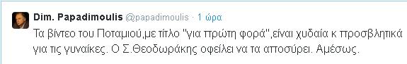 «Τα βίντεο του Ποταμιού, με τίτλο “για πρώτη φορά”, είναι χυδαία και προσβλητικά για τις γυναίκες. Ο Σ. Θεοδωράκης οφείλει να τα αποσύρει. Αμέσως», σχολίασε ο κ. Παπαδημούλης.