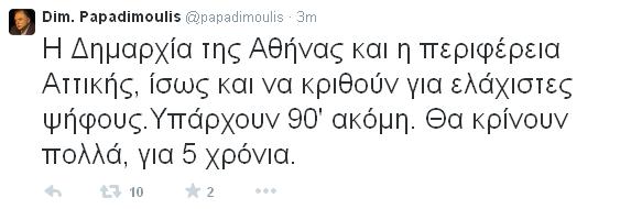 «Η Δημαρχία της Αθήνας και η περιφέρεια Αττικής, ίσως και να κριθούν για ελάχιστες ψήφους. Υπάρχουν 90′ ακόμη. Θα κρίνουν πολλά, για 5 χρόνια», έγραψε χαρακτηριστικά στον λογαριασμό του στο Twitter ο κ. Παπαδημούλης.