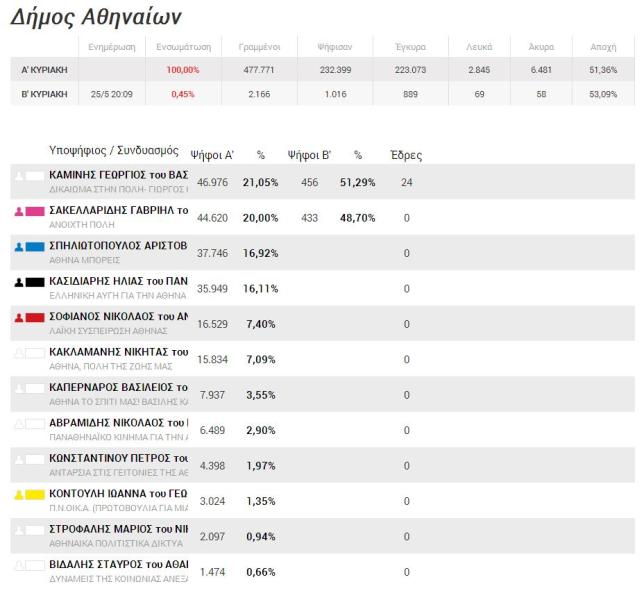 Ντέρμπι Γαβριήλ Σακελλαρίδη και Γιώργου Καμίνη δείχνουν τα πρώτα αποτελέσματα για το Δήμο της Αθήνας.
