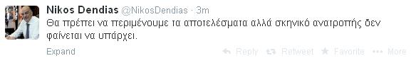 «Δεν φαίνεται να υπάρχει σκηνικό ανατροπής», σχολίασε πριν από λίγο στο λογαριασμό του στο Twitter o υπουργός Δημόσιας Τάξης και Προστασίας του Πολίτη, Νίκος Δένδιας.