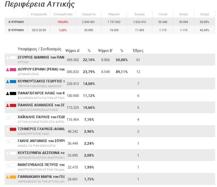 Σύμφωνα με τα πρώτα αποτελέσματα του υπουργείου Εσωτερικών, με ενσωμάτωση μόλις στο 0,89%, προηγείται ο Γιάννης Σγουρός με 50,42% και ακολουθεί η Ρένα Δούρου με 49,57%.