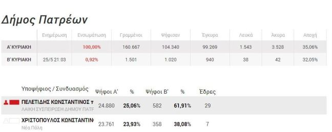 Δείτε τα αποτελέσματα στο δήμο Πατρέων. Ενσωμάτωση: 0,92%