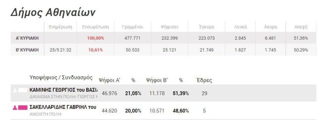 Δείτε τα αποτελέσματα στο δήμο Αθηναίων. Ενσωμάτωση: 10,61%