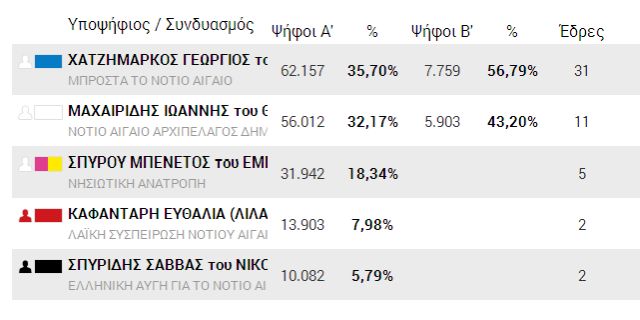 Προβάδισμα του Γιώργου Χατζημάρκου έναντι του Ιωάννη Μαχαιρίδη στην περιφέρεια Νοτίου Αιγαίου δείχνουν τα μέχρι στιγμής αποτελέσματα του β’ γύρου των περιφερειακών εκλογών.