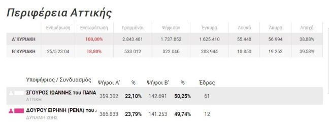 Περνάει μπροστά ο υποψήφιος περιφερειάρχης Αττικής, Γιάννης Σγουρός, συγκεντρώνοντας 50,25% με την ενσωμάτωση να φτάνει το 18,8%. Η Ρένα Δούρου συγκεντρώνει το 49,74%.