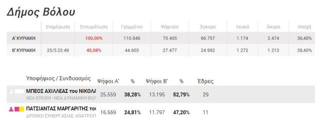 Τη μάχη για τη δημαρχία του Βόλου φαίνεται να κερδίζει ο Αχιλλέας Μπέος, καθώς συγκεντρώνει το 52,79% με την ενσωμάτωση να βρίσκεται στο 40,08%.